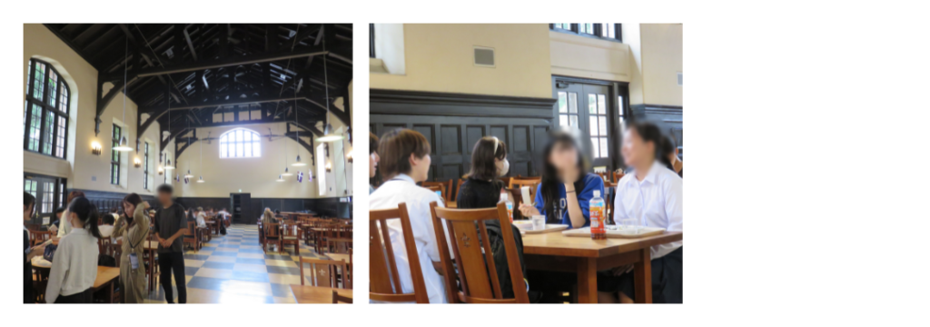 昼食はハリーポッターの世界のようだと評判の高い第一食堂で、ラーメン、カツカレー、丼物などの豊富なメニューから好きなものを選んで、大学生たちと歓談しながら学食を堪能しました。