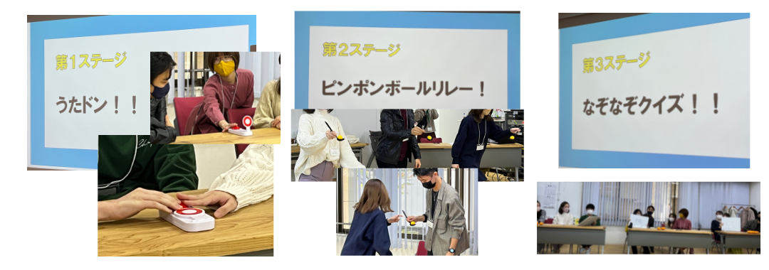 第1ステージは音楽を聴いて曲名を当てる「うたドン」、第2ステージはおたまにピンポンボールを乗せて移動する「ピンポンボールリレー」、第3ステージは「なぞなぞクイズ!!」
