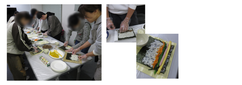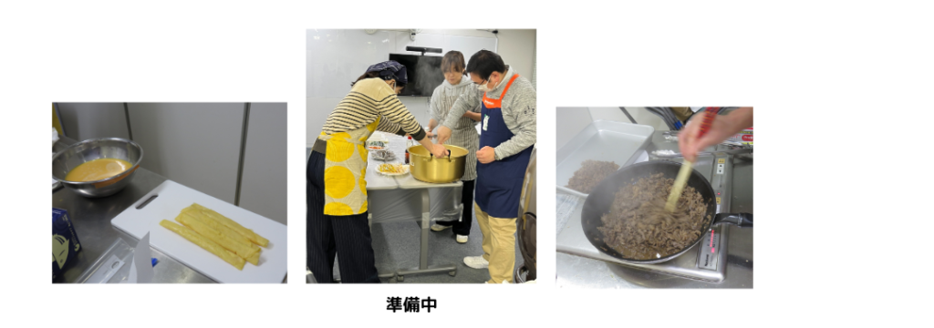 お昼は、株式会社パル・ミート様から今年もたくさんのお肉類を寄付していただき、その中の牛肉を使って、キンパ作りに挑戦。