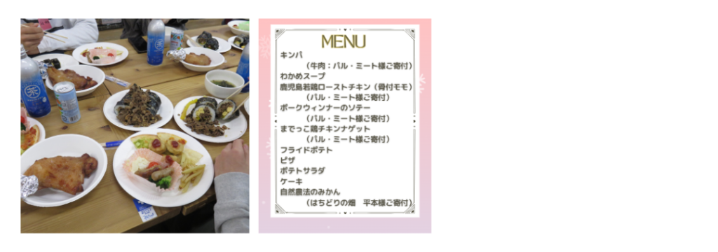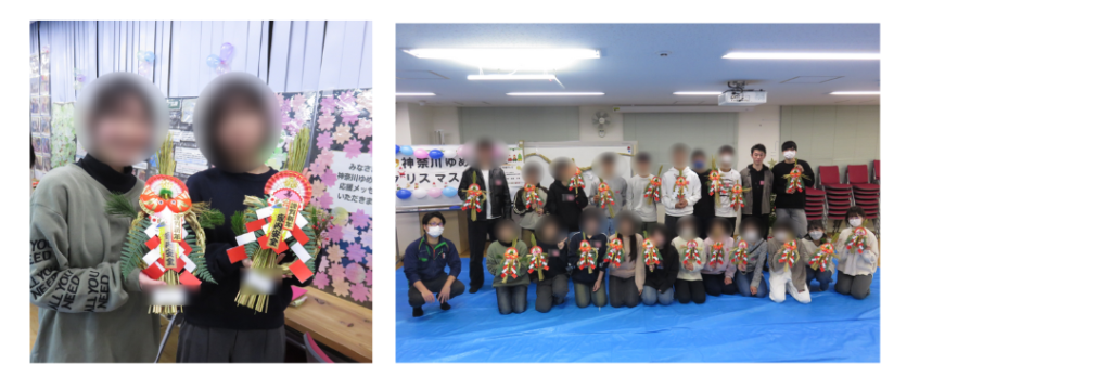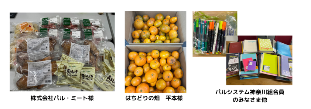 クリスマス交流会を開催するにあたり、しめ縄作りのイベント運営、沢山の食べ物、生活協同組合パルシステム神奈川主催のセンターまつり、パルゆめつなごう展などで寄付いただいたノートなどもクリスマスプレゼントとして贈りました。