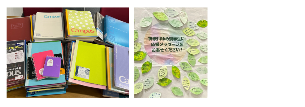 奨学生向けての未使用ノートや応援メッセージ、寄付が寄せられたことに、事務局一同、感謝の一日となりました。