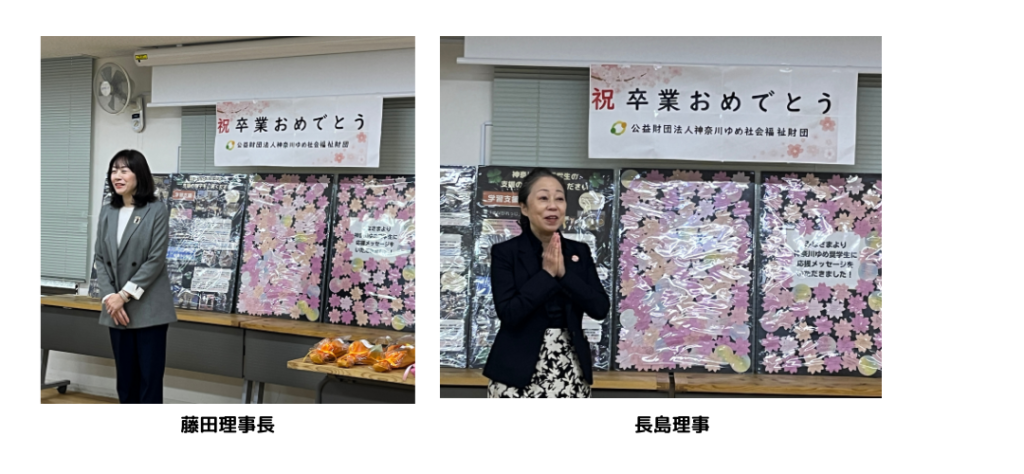 神奈川ゆめ社会福祉財団の藤田順子理事長と長島由佳理事よりお祝いの言葉をいただき、財団からお祝いの品を贈呈。