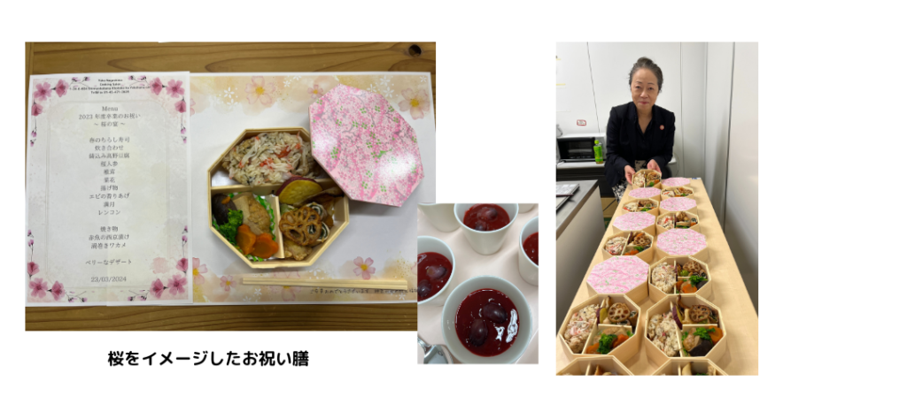 その後は、今年もナガシマユカクッキングサロン主宰、料理研究家の長島理事にご準備いただき、桜をイメージしたお祝い膳でおもてなしです。