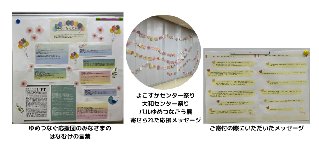 会場には、マンスリーサポーター「ゆめつなぐ応援団」のみなさまからのはなむけの言葉、ご寄付の際に寄せていただいたメッセージ、パルシステム神奈川様主催のよこすかセンター祭り、大和センター祭り、パルゆめつなごう展で寄せられた沢山の応援メッセージで奨学生を送り出すことができました。