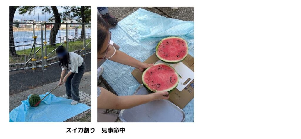 スイカ割りでは女子の奨学生3名が選出され、まず目隠しした状態でくるくる回り、フラフラしながらみんなの声を頼りにスイカの方へ。大爆笑です。