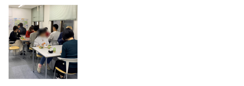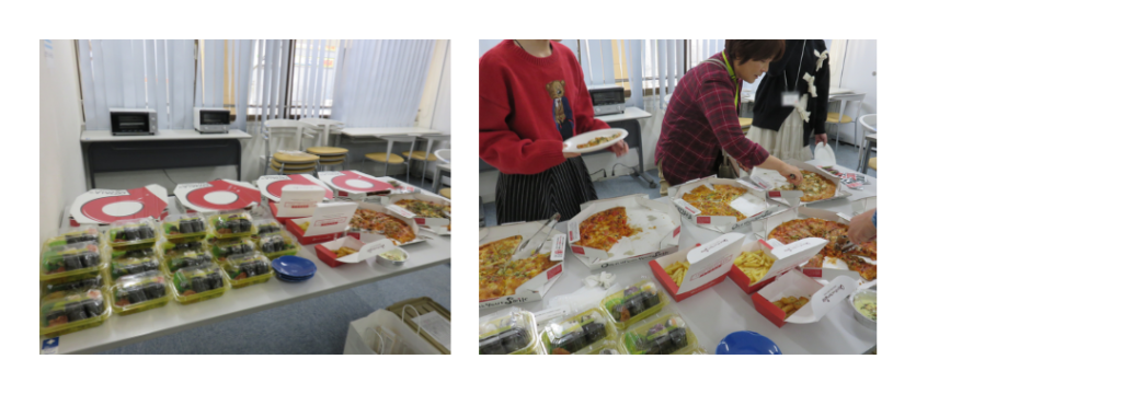 バイキング形式で数種類あるピザやおにぎりセットの種類を確かめながら、あれにしようか、これにしようかと迷いながら選び、各々好きな席に座って歓談しながらの賑やかな昼食の場となりました。