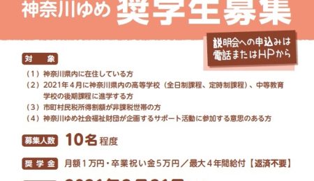 2020.12.14 / 最終更新日 : 2023.04.05 KANA 報告 2021年度 神奈川ゆめ奨学生の募集を開始いたしました 2021年度第4期奨学生の受付を終了いたしました。多数のご応募、お問い合わせありがとうございました。