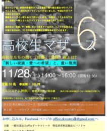 2020.10.07 / 最終更新日 : 2023.04.05 KANA 報告 【イベント開催のお知らせ】「高校生マザーズ6」(11/28開催) 高校生たちの抱く「妊娠」「家族」像とは? ~「新しい家族・愛への希望」と、思い現実~ 今回で6回目をむかえるこのイベントは、一般社団法人 officeドーナツトークと NPO法人 パノラマが主催、パルシステム神奈川の共催 […]