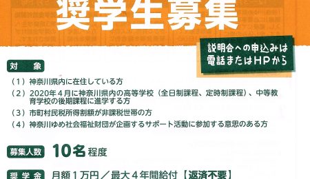 2019.12.23 / 最終更新日 : 2023.04.05 KANA 報告 「第3期(2020年度)神奈川ゆめ奨学生募集」2020年1月から開始 高校生を対象とする「第3期神奈川ゆめ奨学生」の募集を2020年1月下旬よりスタートいたします。 神奈川ゆめ奨学金の詳細は次のとおりです。 ◆奨学金の種類◆ 「給付型の奨学金」です。返済の義務はありません。 ◆対 象◆ 下 […]