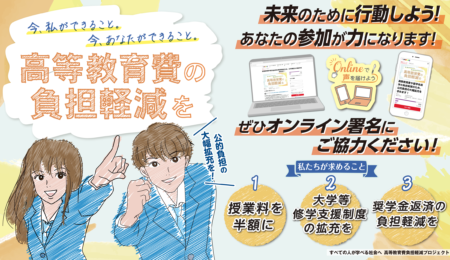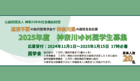 2024.09.30 / 最終更新日 : 2024.09.30 KANA News&Topics 「教育費負担軽減・奨学金制度改善に向けたアピール」に賛同します 公益財団法人神奈川ゆめ社会福祉財団は、経済的理由により修学が困難な高校生に対して、給付型の奨学金を給付するとともに、社会の中で自分らしい生き方を実現できるための学びや体験の機会を地域で活動している人、団体、行政などと広く […]