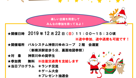 2019.12.01 / 最終更新日 : 2023.04.05 KANA 告知 神奈川ゆめ奨学生 クリスマス会のご案内 日増しに冬の訪れを感じる今日この頃、いかがお過ごしでしょうか。 さて、以前よりお知らせしております「クリスマス会」のご案内です。 今年もランチパーティーに加え、ゲームやプレゼント抽選会など、様々な企画を準備してお待ちして […]