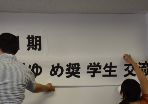 まずは会場の設営から。掲示物を貼り、机を組み合わせて2つの大きなテーブル