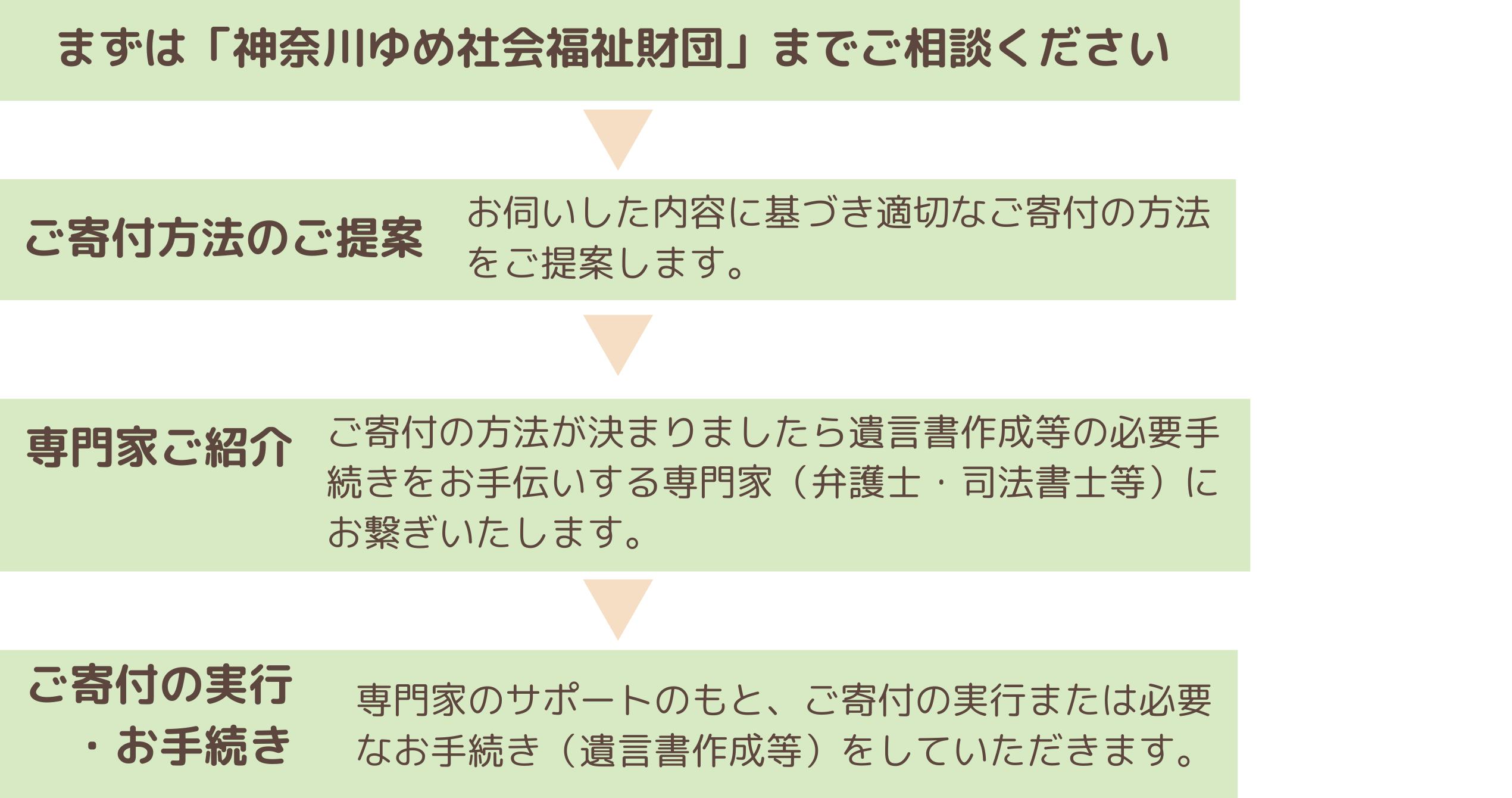 遺贈先を神奈川ゆめ社会福祉財団に指定した遺言書を生前に作成することで、ご自身の財産の一部または全てをご寄付いただくことができます。
